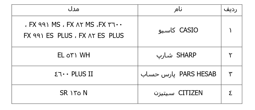 استفاده از ماشين حساب در آزمون ارشد پزشکي ۹۴ مجاز شد. مرکز سنجش پزشکی اعلام کرد با توجه به اعلام دبيرخانه شورای آموزش علوم پایه پزشکی، بهداشت و تخصصی داوطلبان رشته های مهندسی پزشکی(بيوالکتریک – زیست مواد)، فيزیک پزشکی، رادیوبيولوژی، مهندسی بهداشت حرفه ای و ارگونومی مجاز به استفاده از ماشين حساب می باشند. نوع ماشين حسابی که داوطلبان می توانند استفاده نمایند به شرح جدول ذیل می باشد. لازم به ذکر است استفاده از هرگونه ماشين حساب های پيشرفته و دارای امکانات برنامه ریزی، ممنوع می باشد.